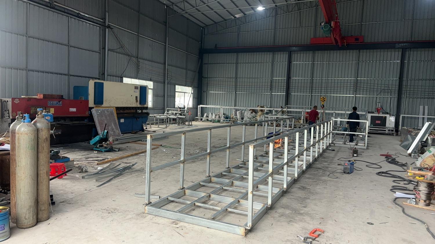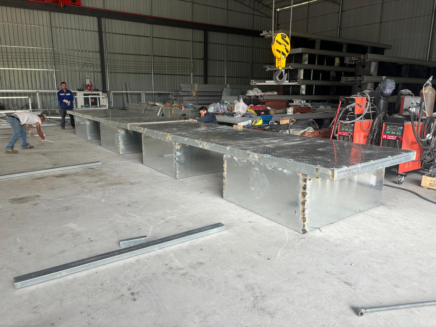 热镀锌钢结构浮桥框架由钢材制成,通过完全焊接连接,表面热镀锌处理,结构坚固,耐腐蚀性强。该系统通过配套的塑料浮筒或HDPE浮箱提供浮力支撑,确保浮桥稳定漂浮于水面之上。